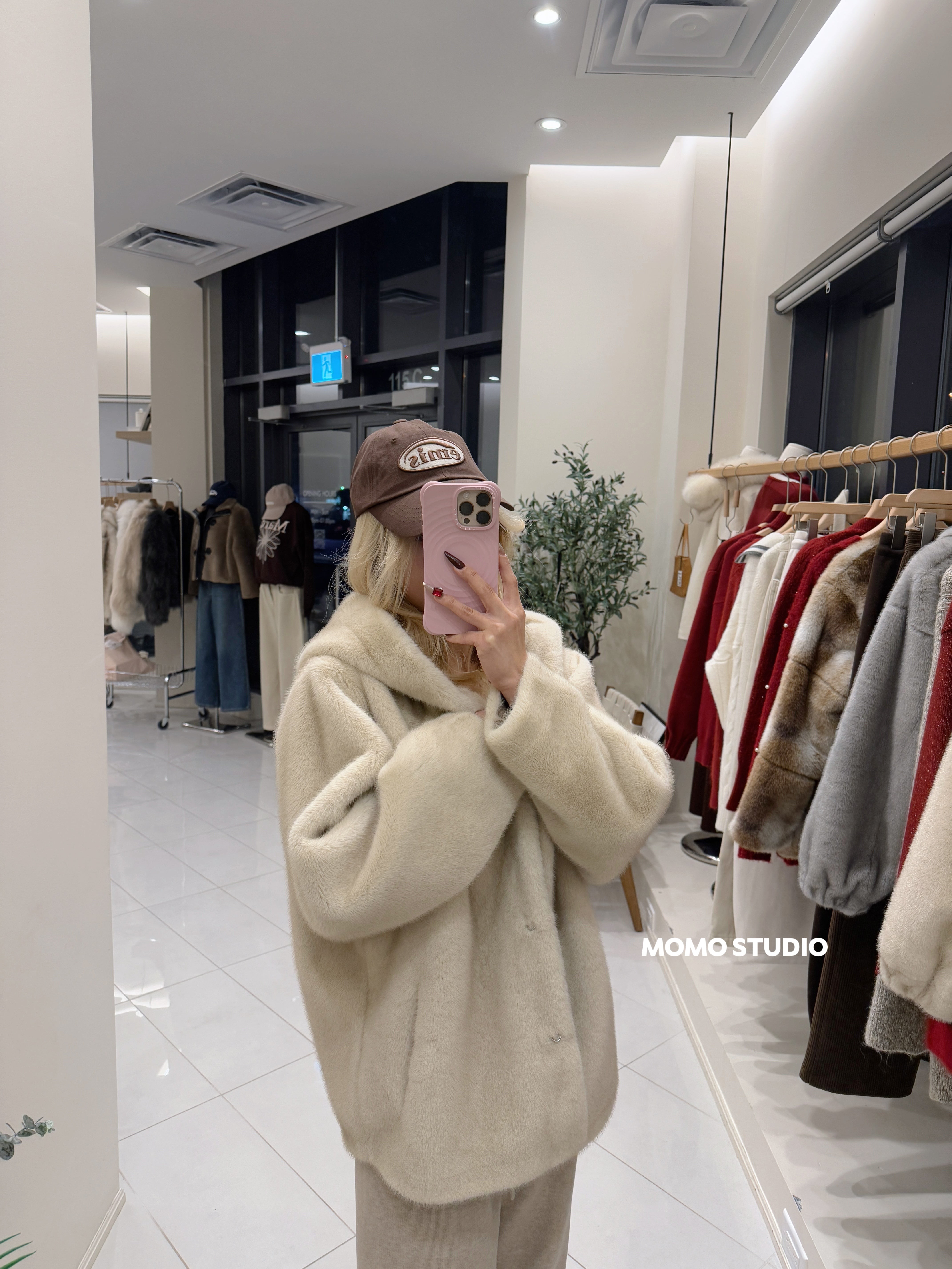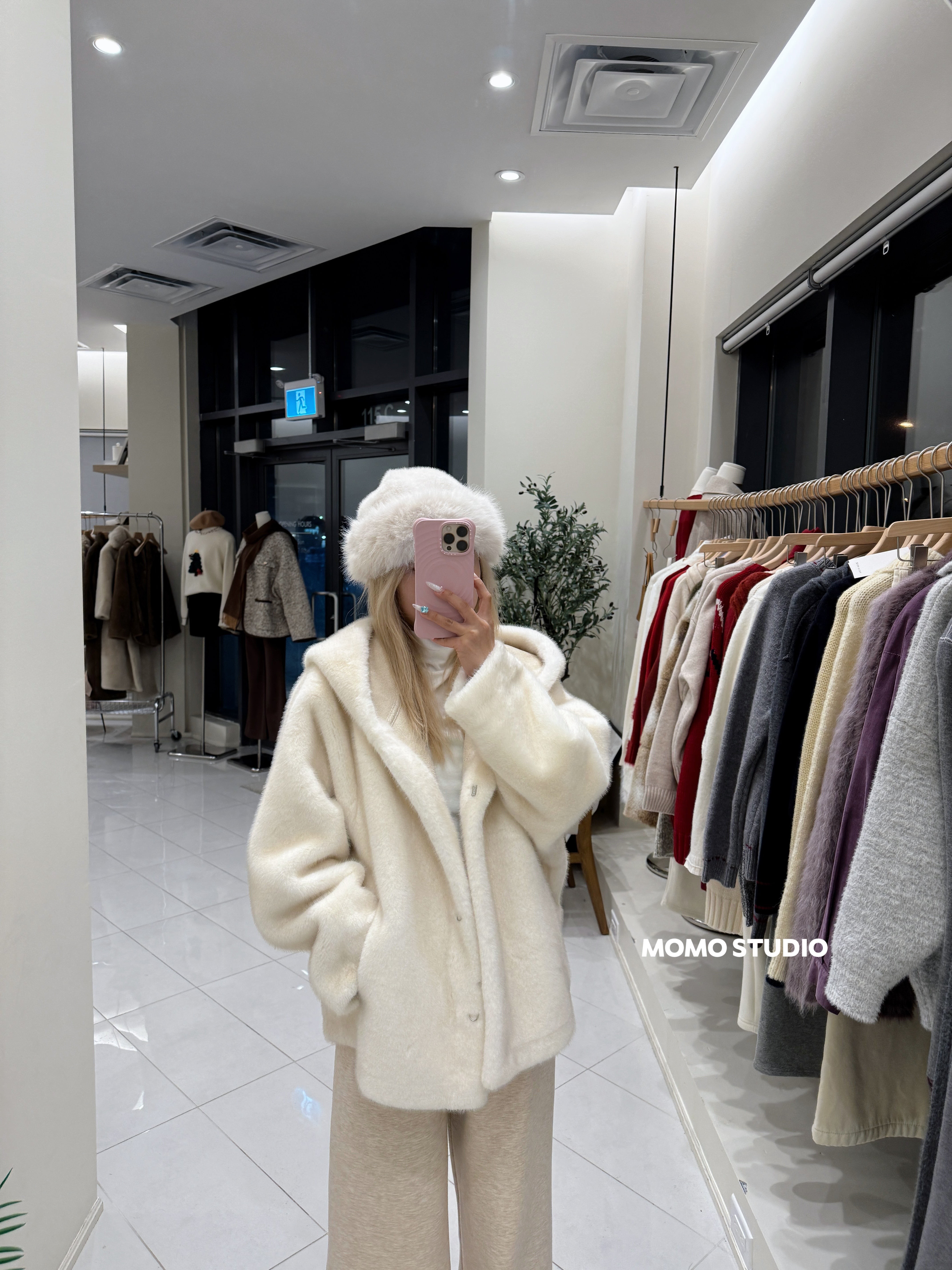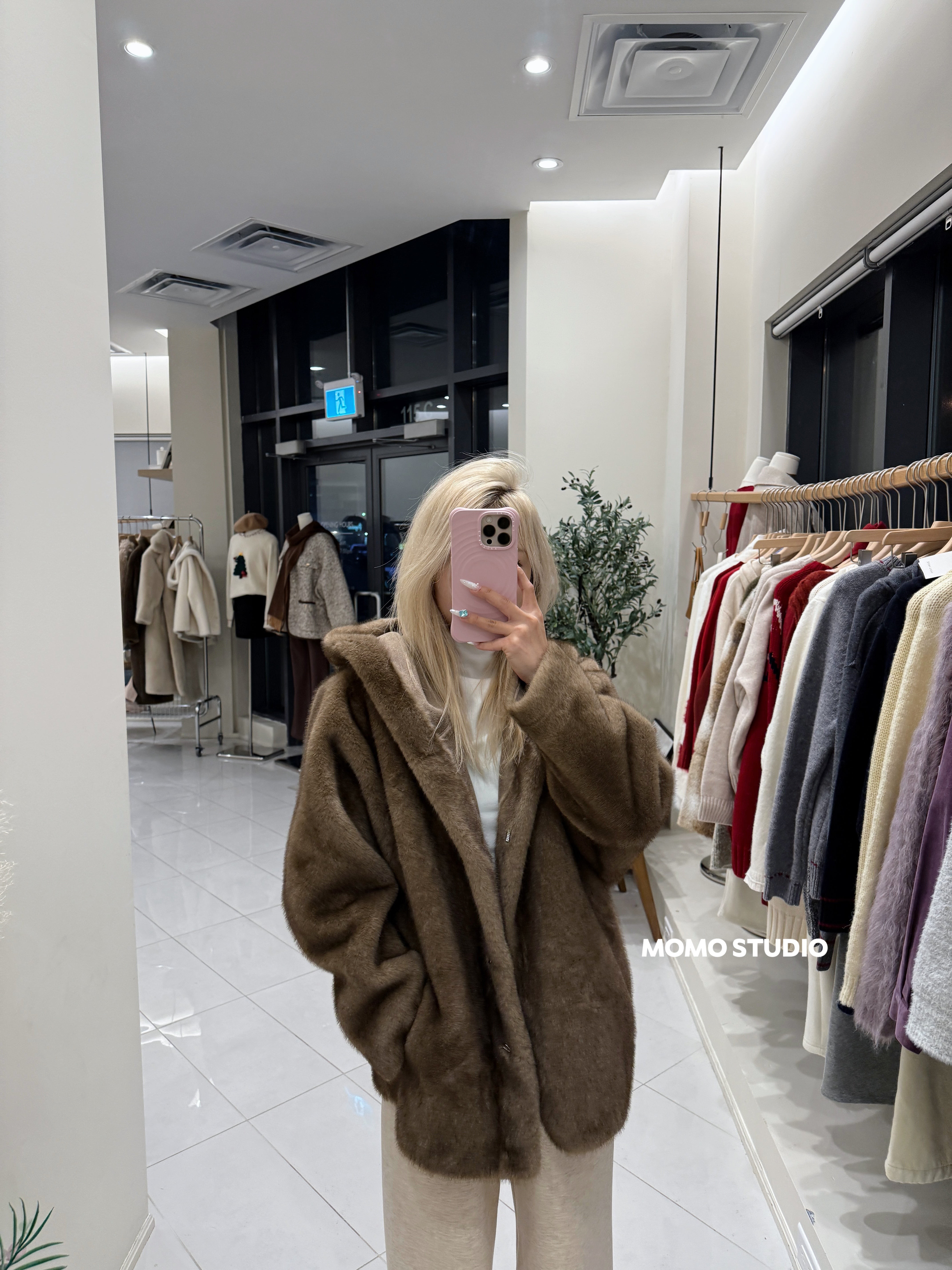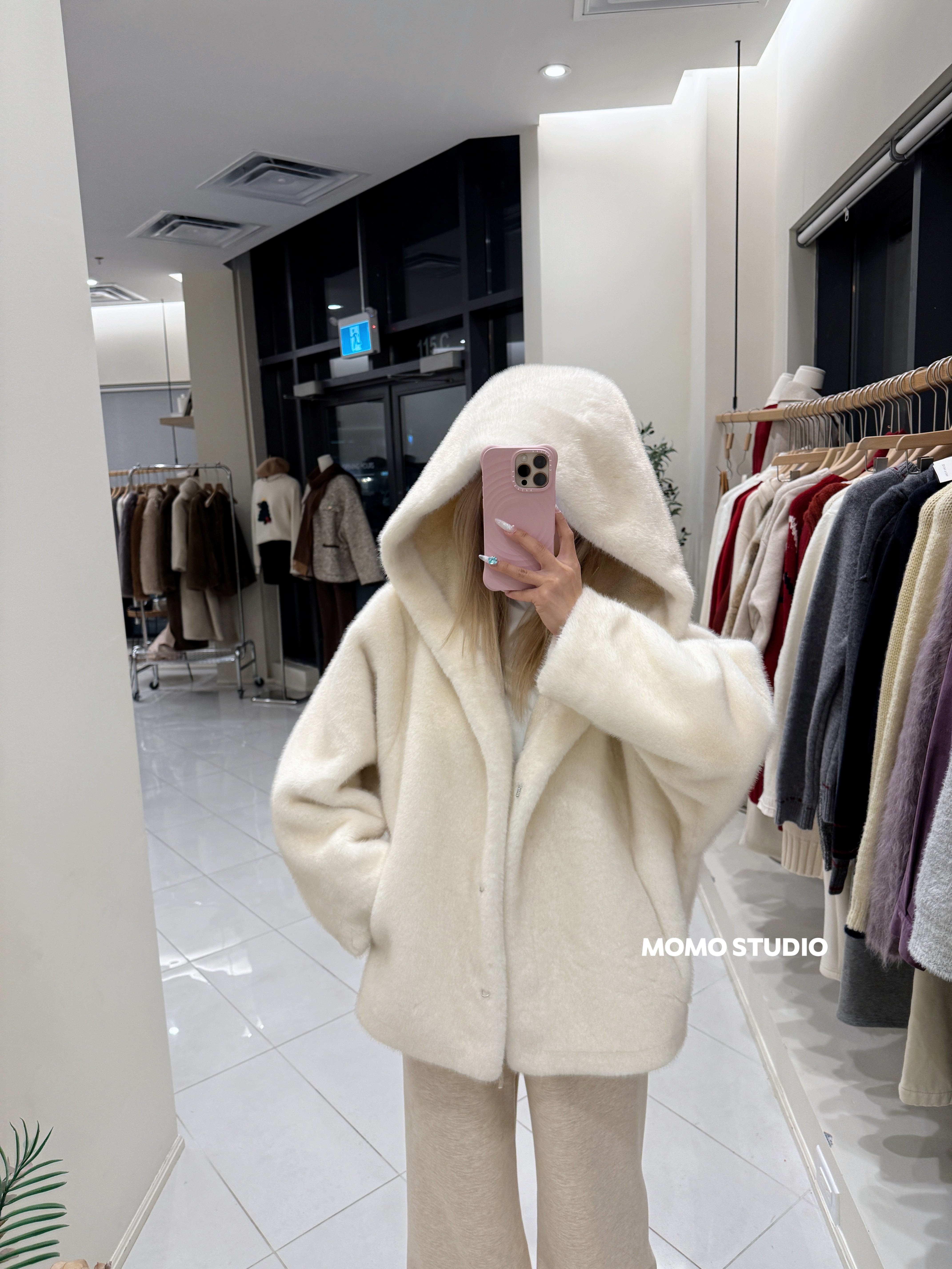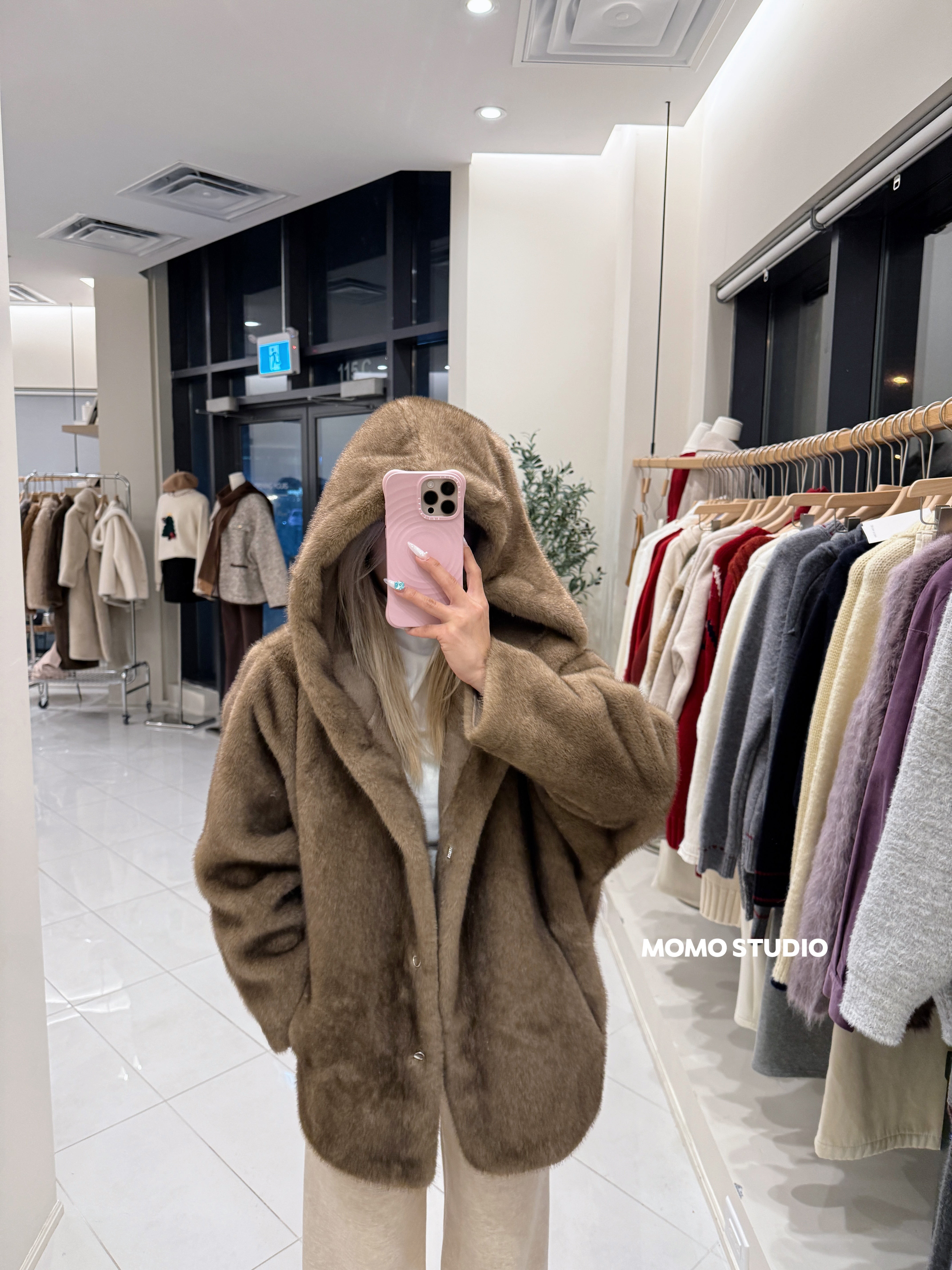 MOMO 连帽仿貂绒中长款外套