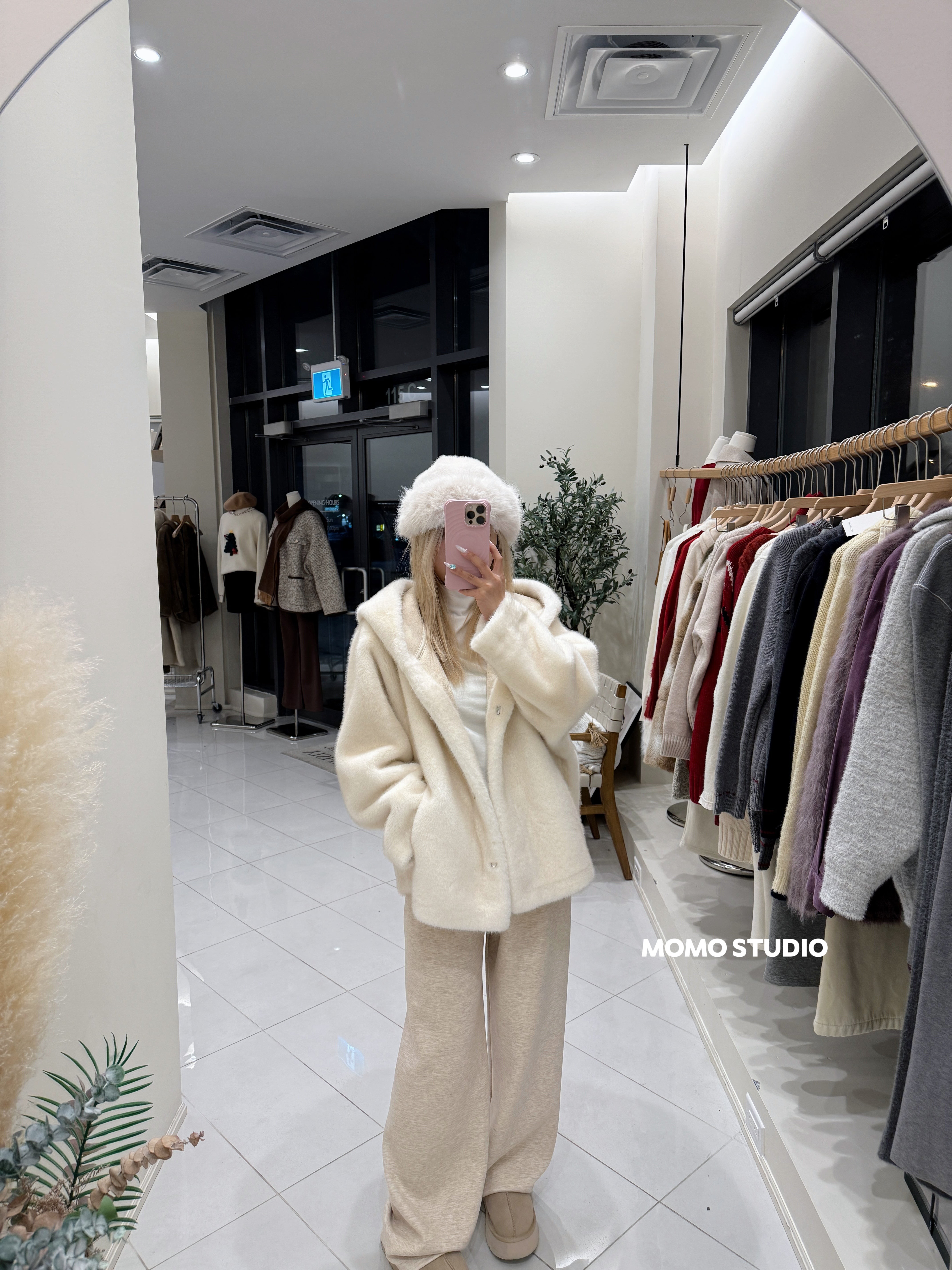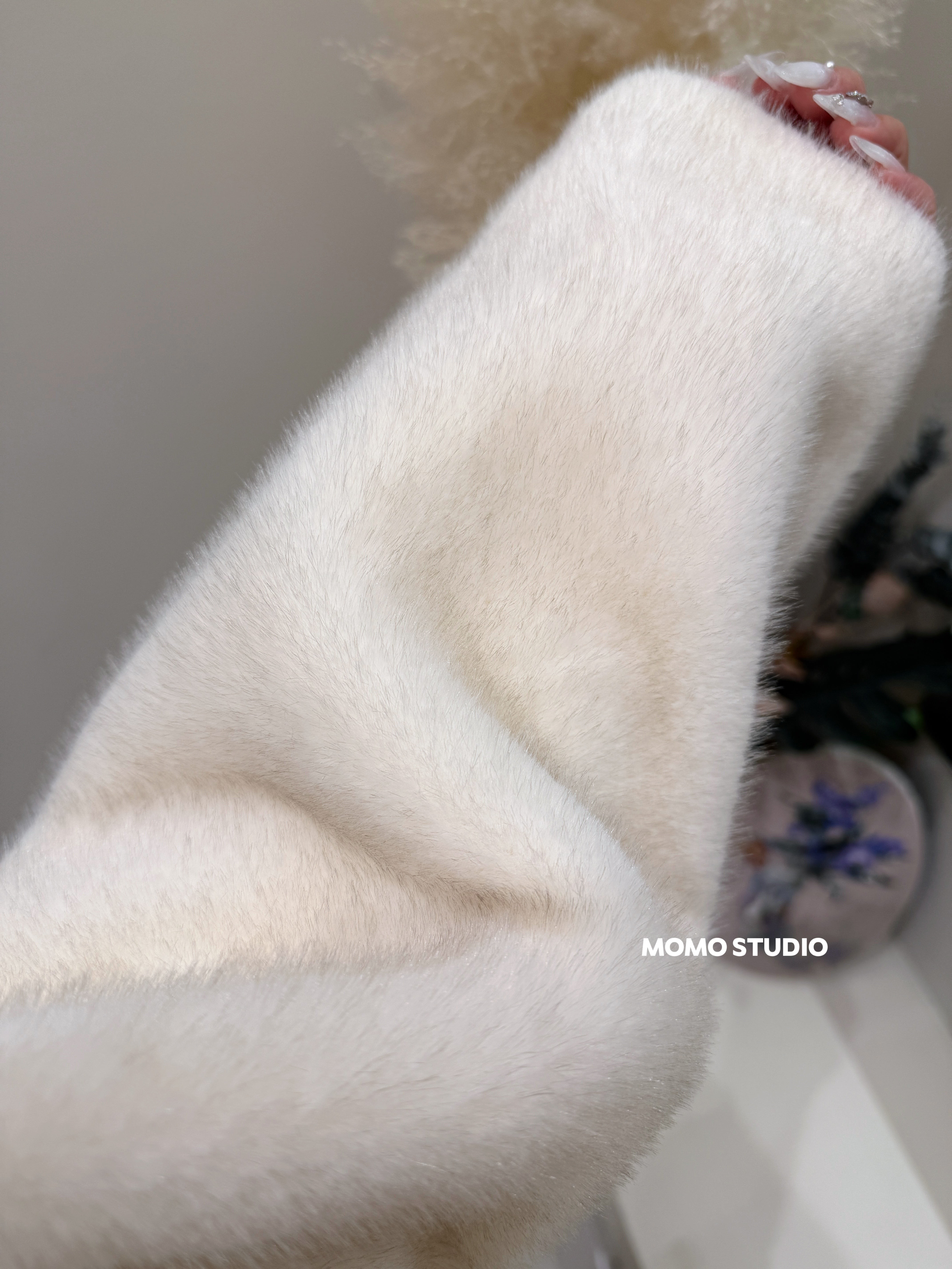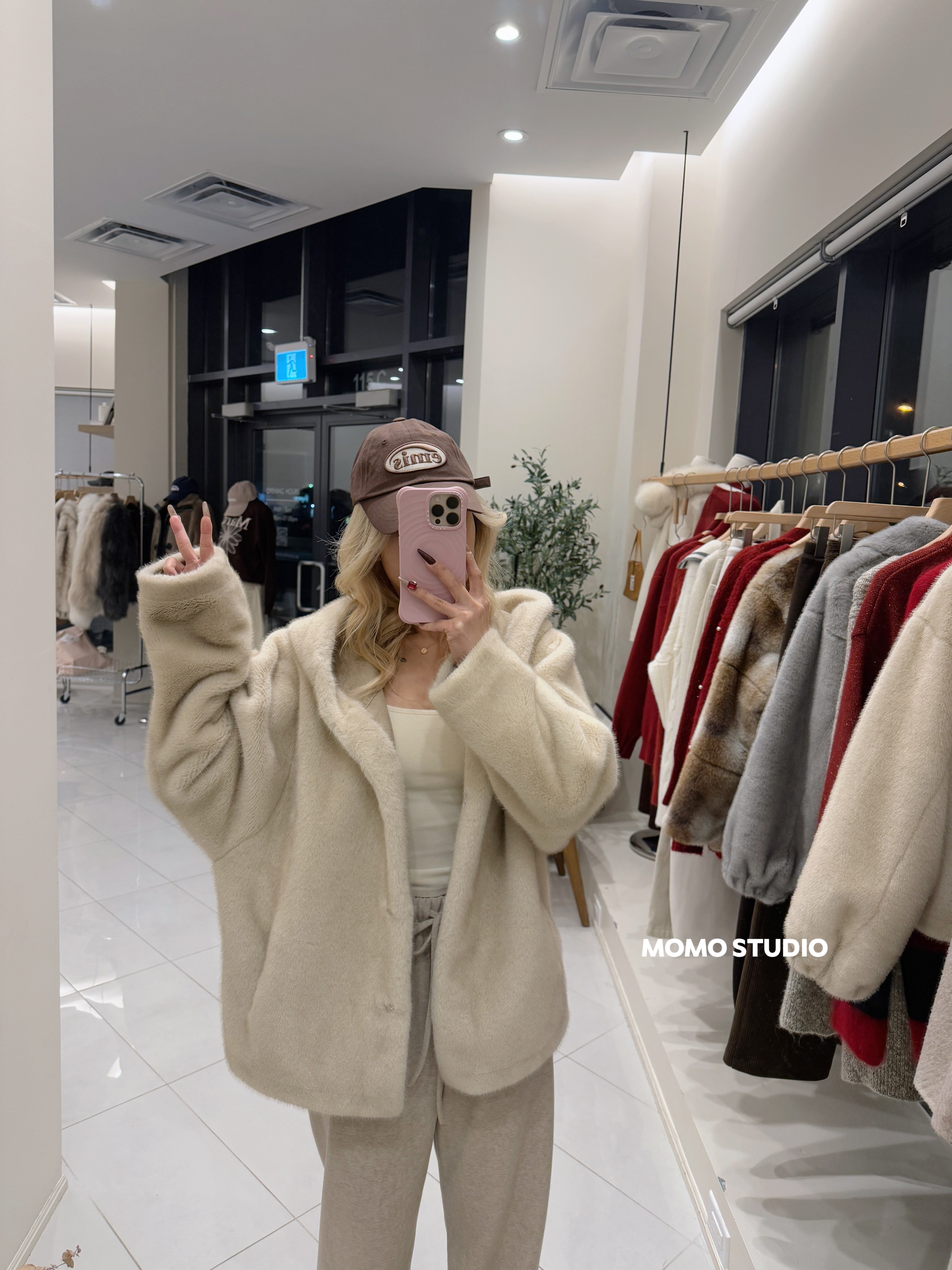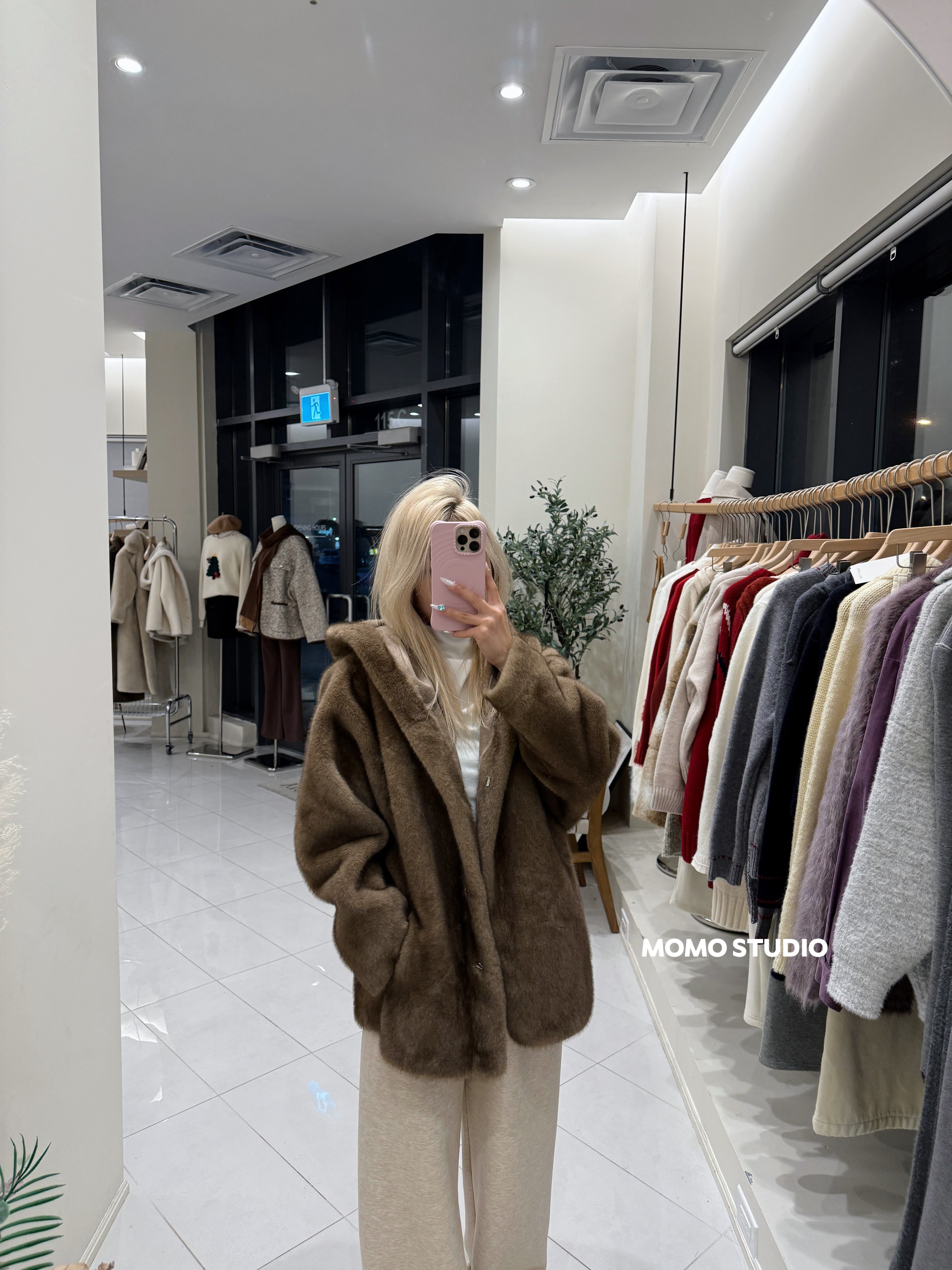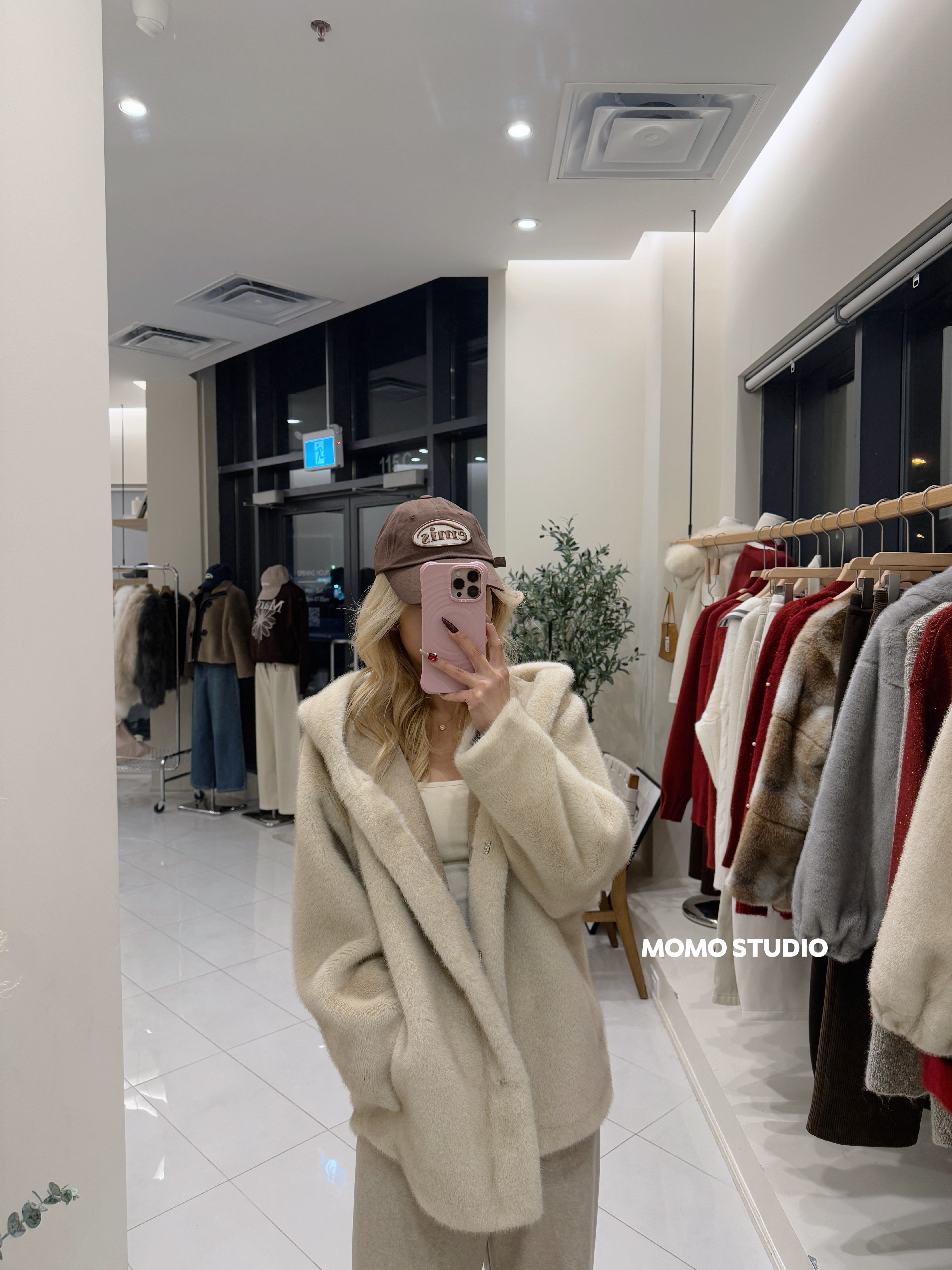 MOMO 连帽仿貂绒中长款外套