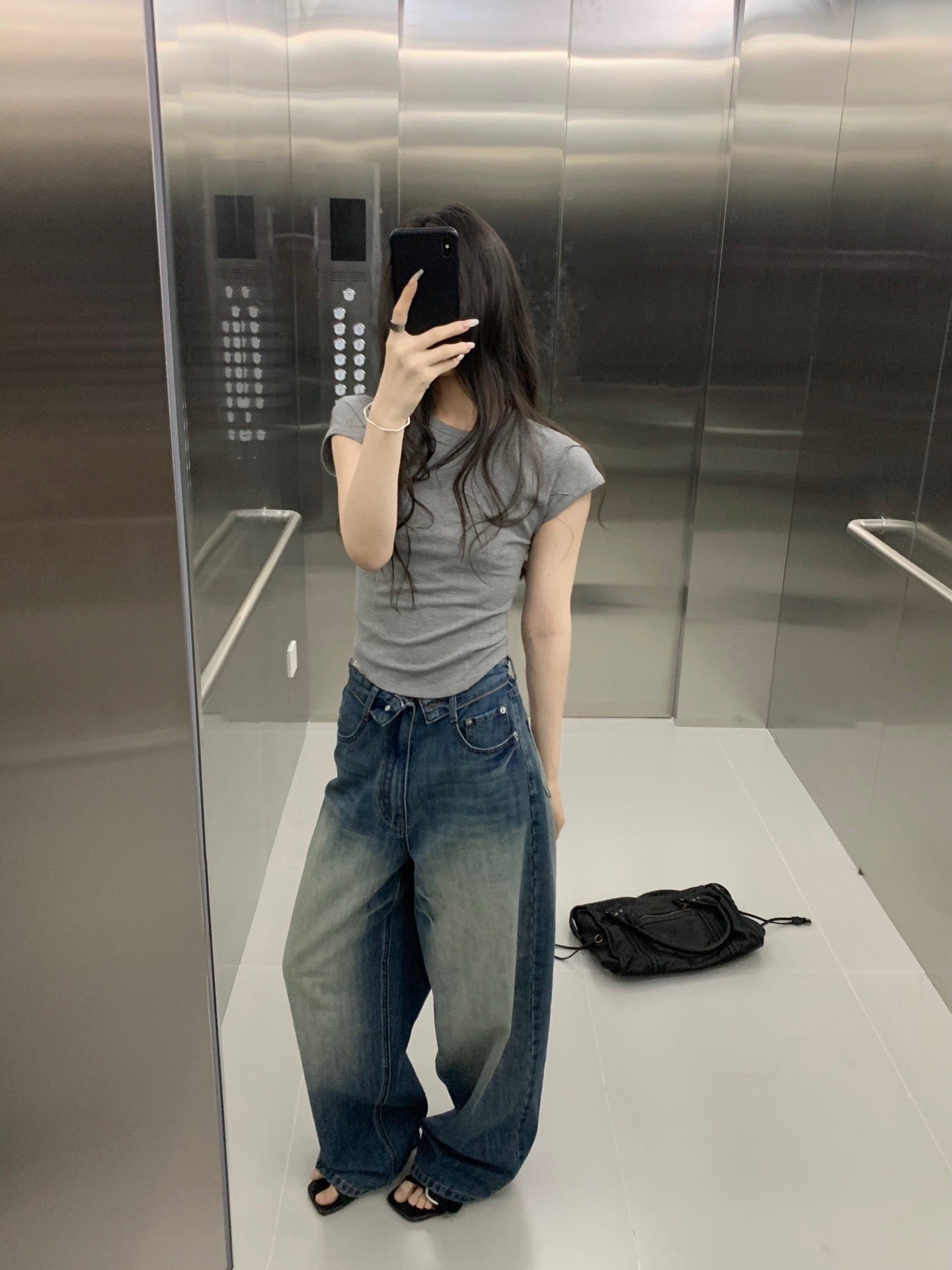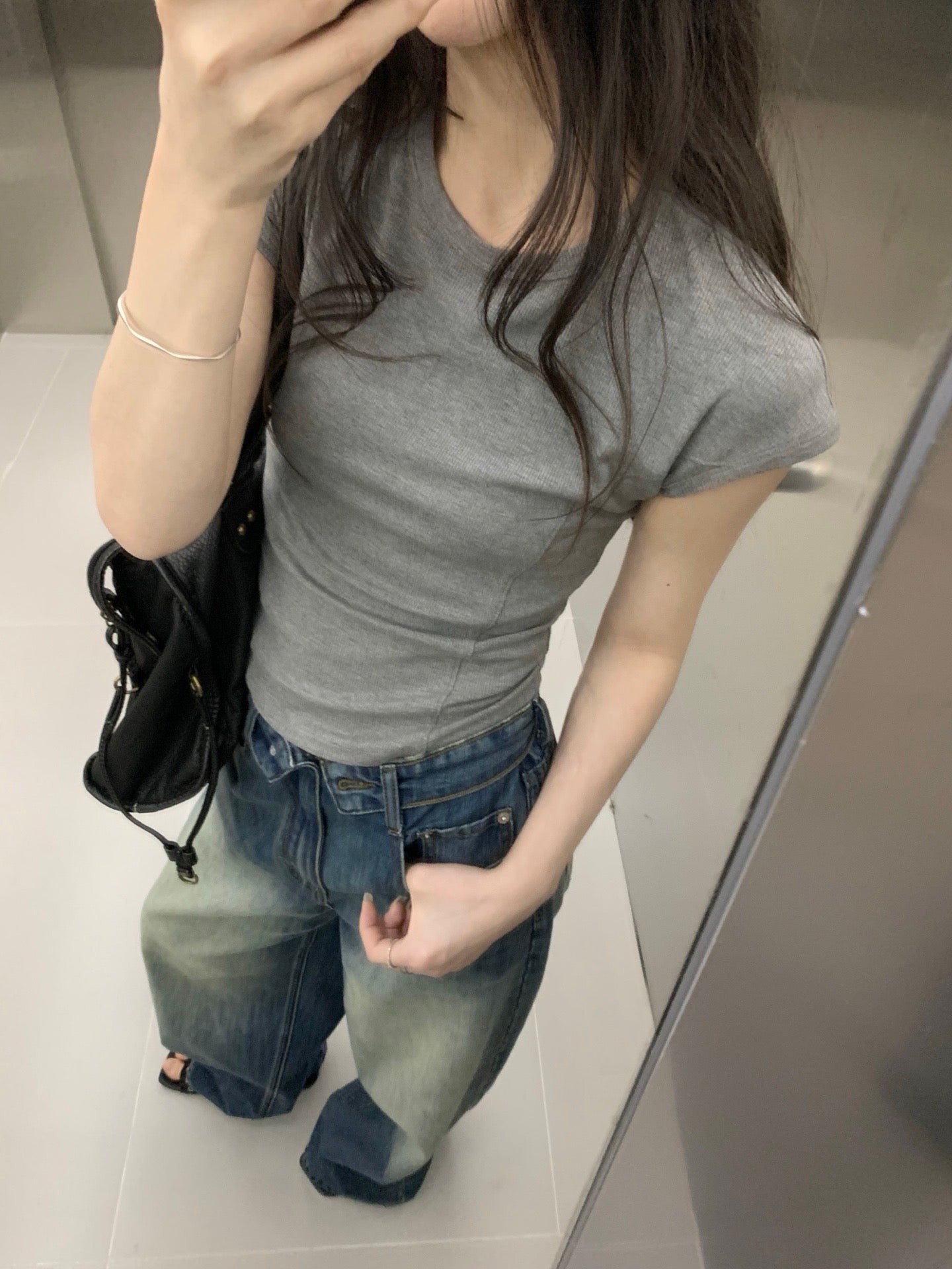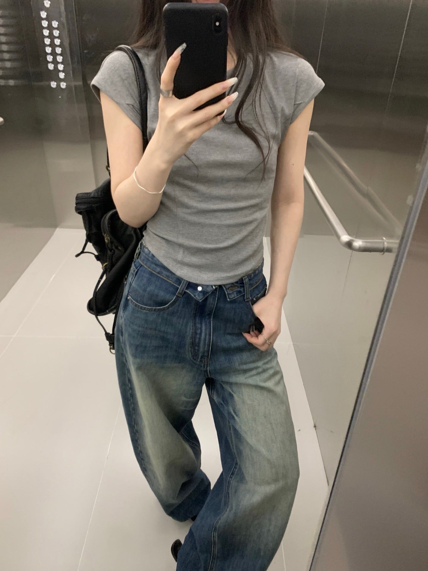 Folded waist washed jeans