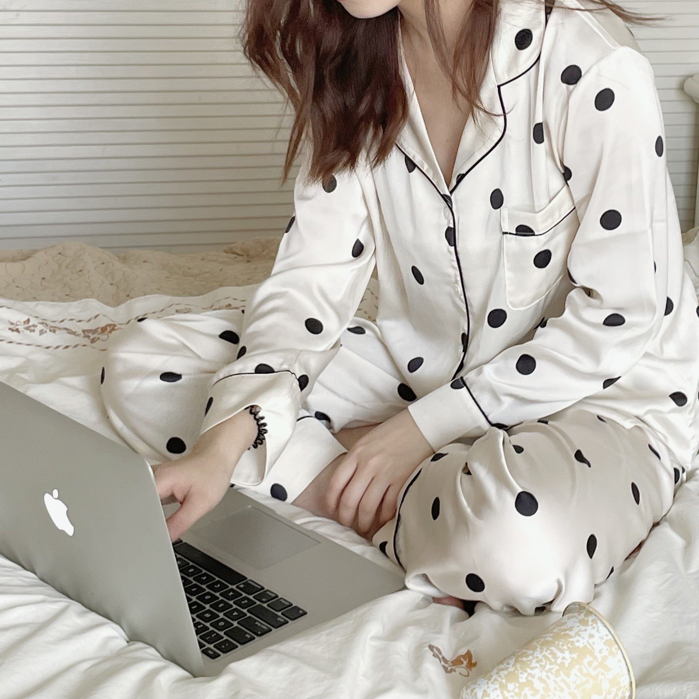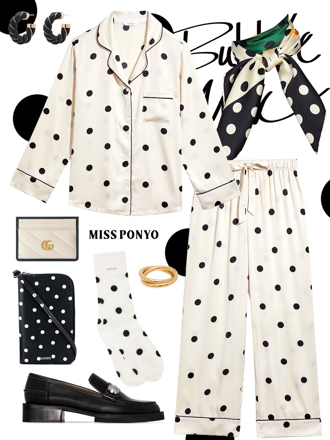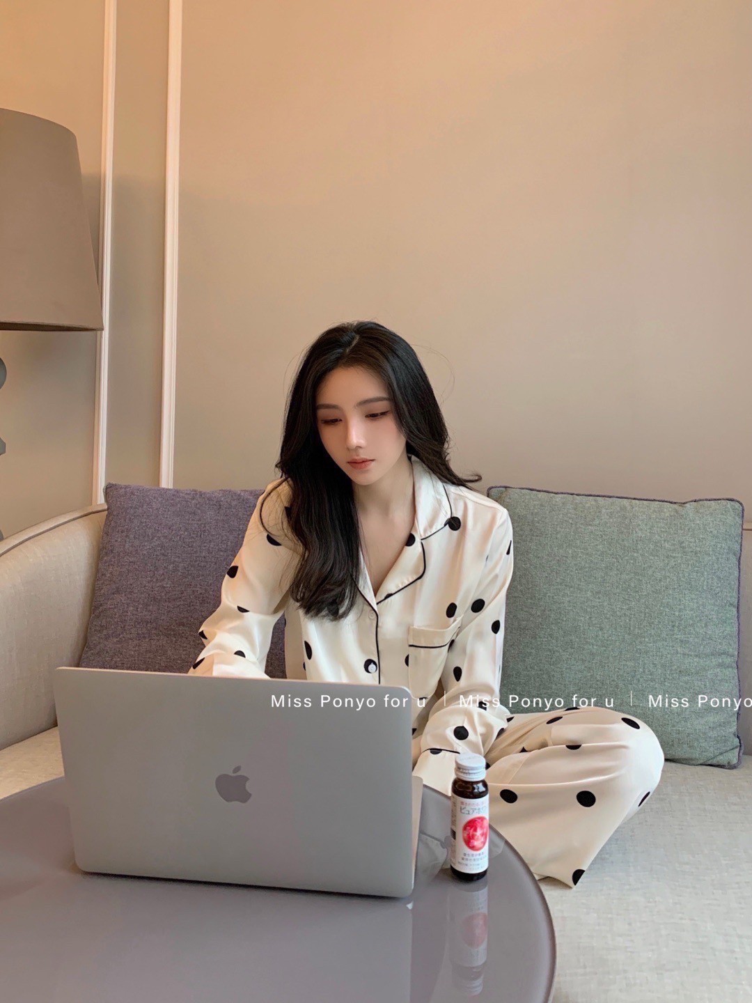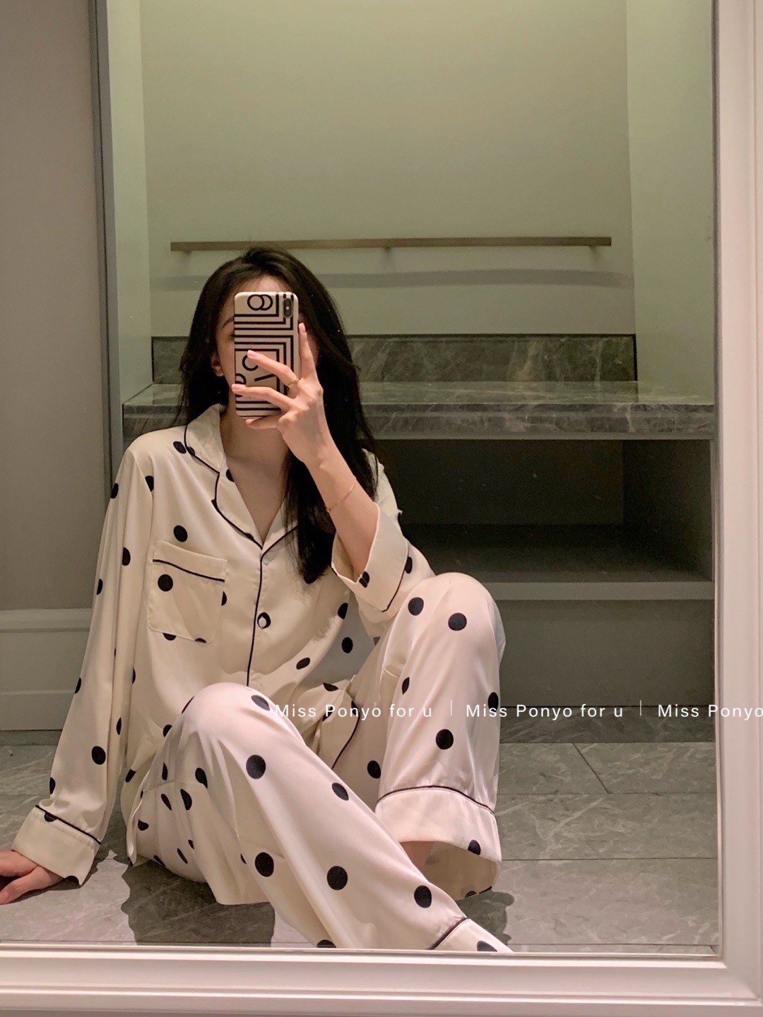 MISS PONYO CHIC系列牛乳啵啵牛仔丝波点长袖长裤女士两件套