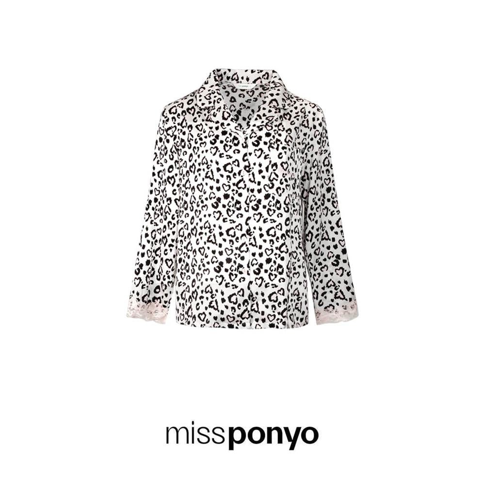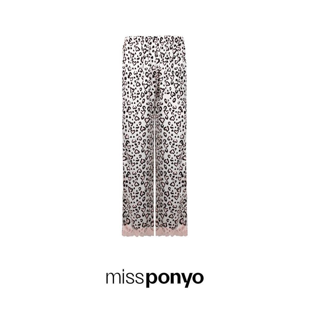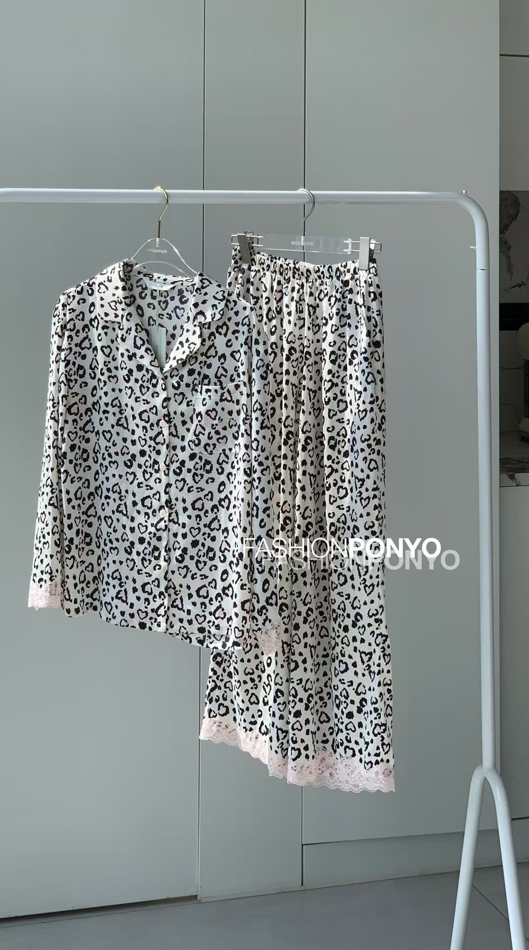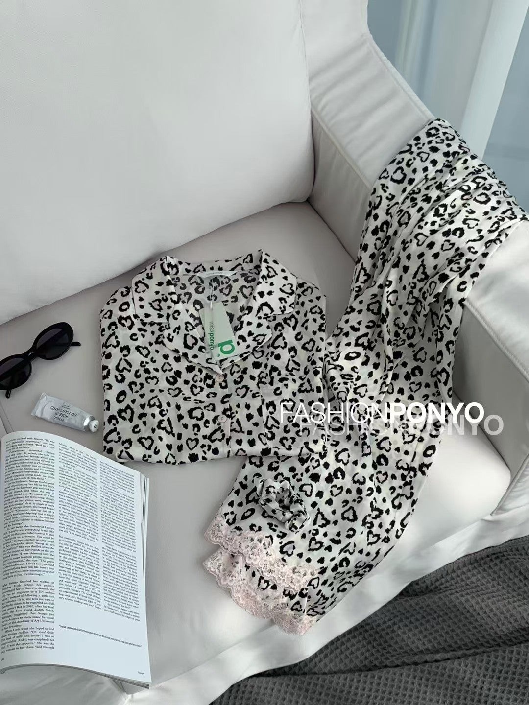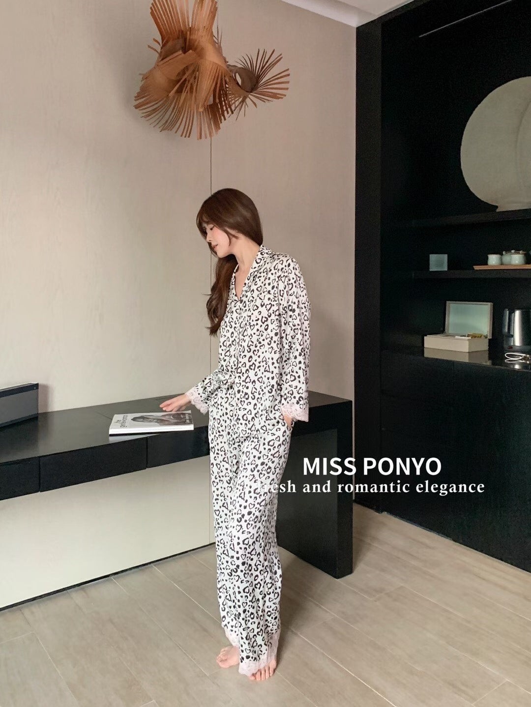 MISS PONYO Girl Friend Leopard lace trim Satin pajama set