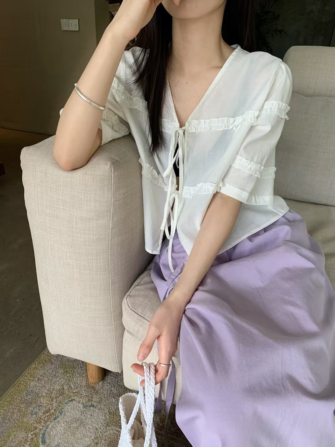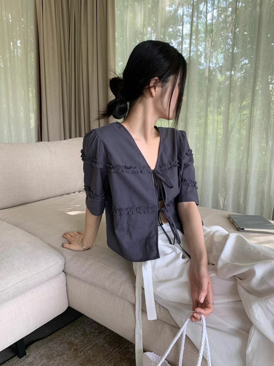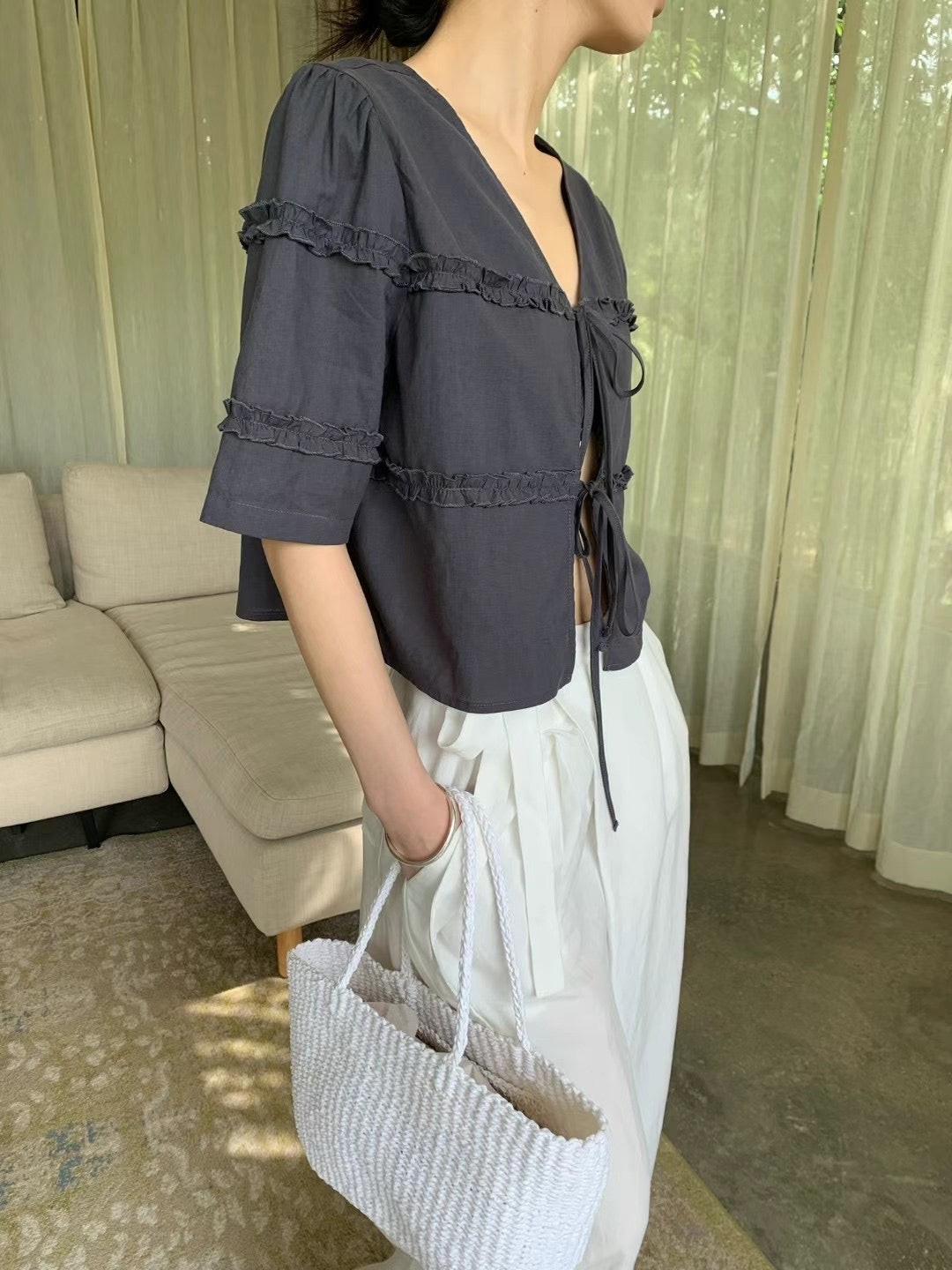 Short-sleeved blouse with lace trim and drawstring at the hem