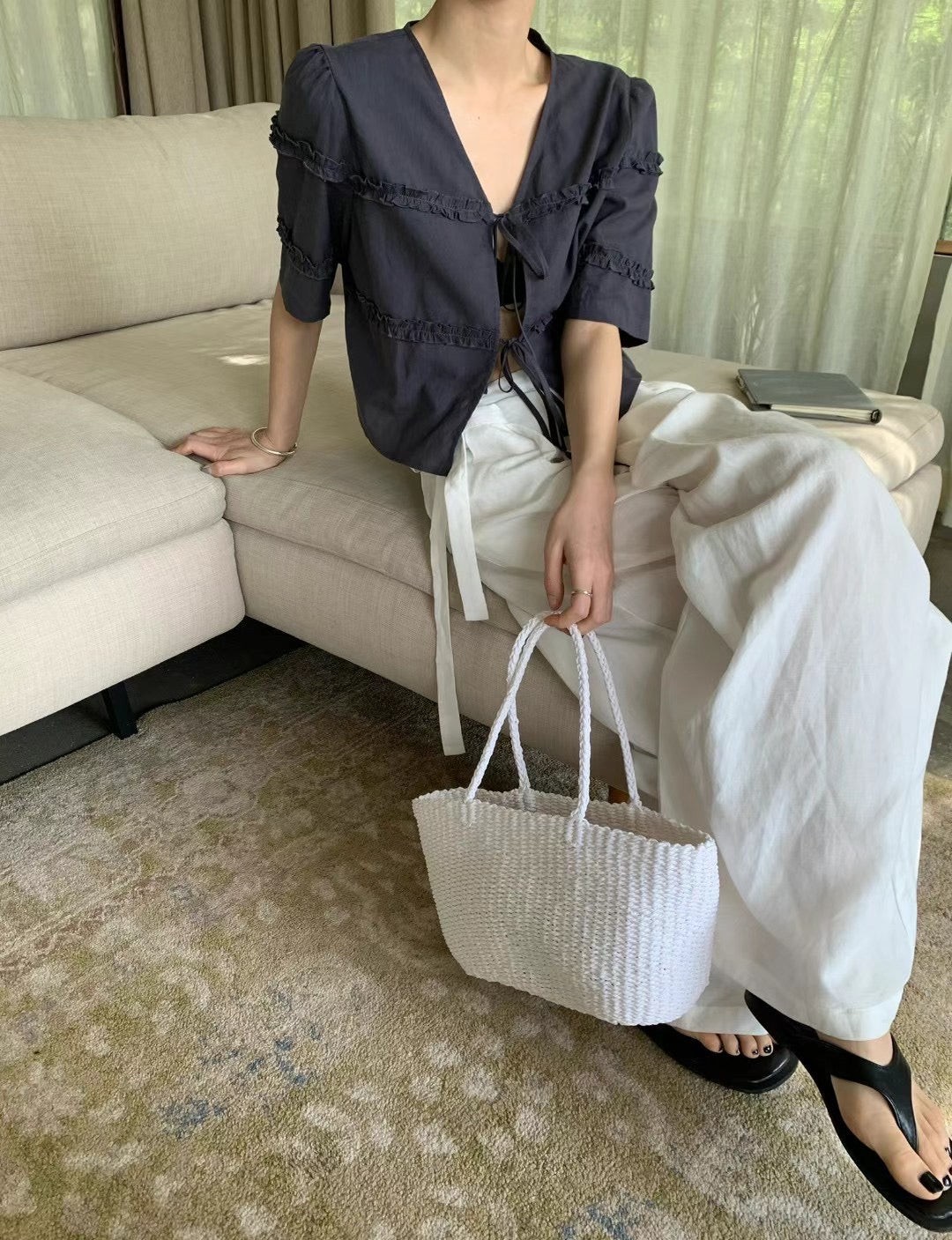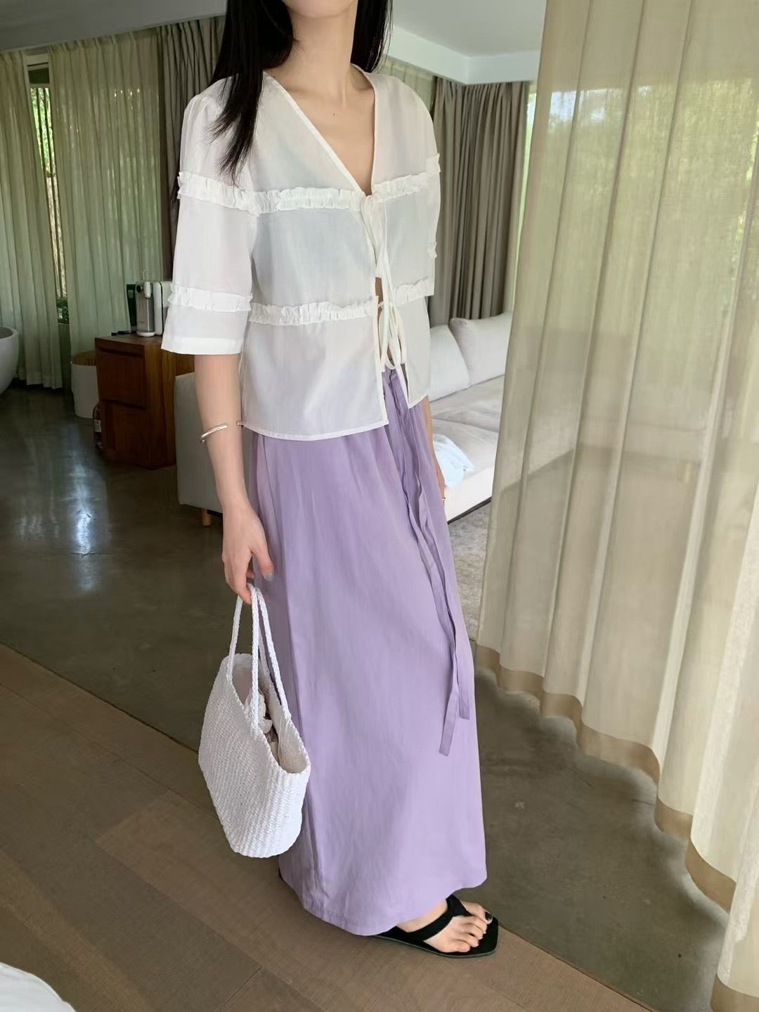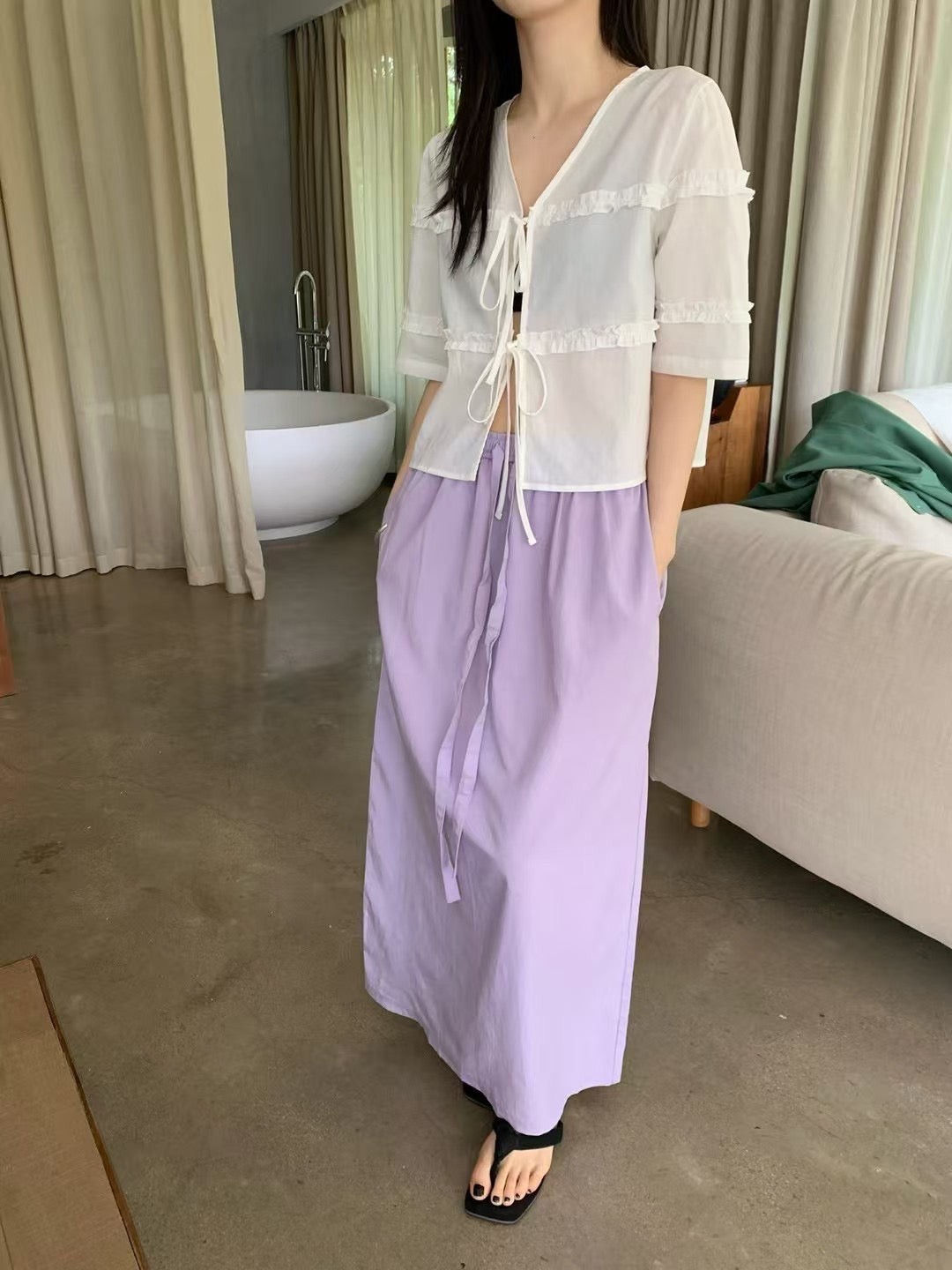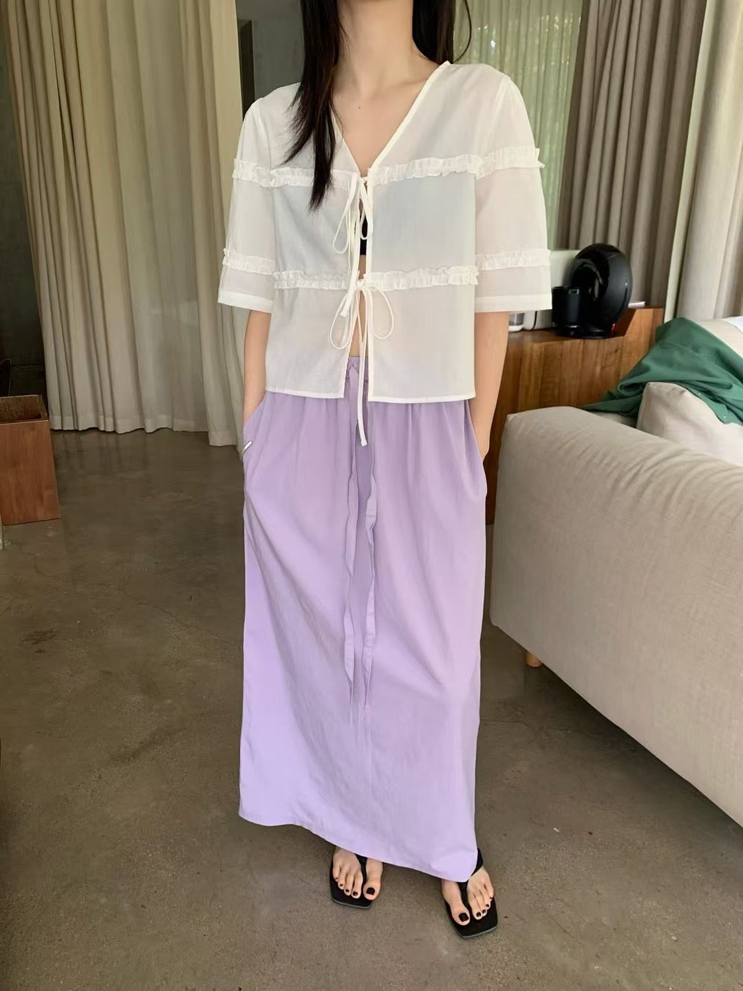 Short-sleeved blouse with lace trim and drawstring at the hem